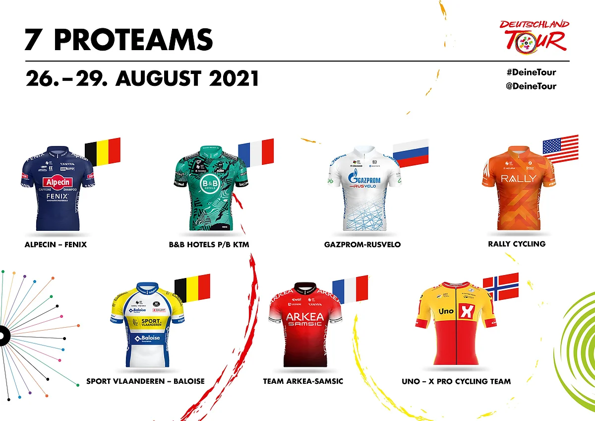 Gemäß den Regeln des Weltverbandes können die Mannschaften bis zum 25. August Änderungen an ihrer vorläufigen Besetzung vornehmen. Die finale Startliste der Deutschland Tour wird vor der Teampräsentation, die am 25. August um 18:00 Uhr auf der Hafeninsel in Stralsund stattfindet, bekanntgegeben.