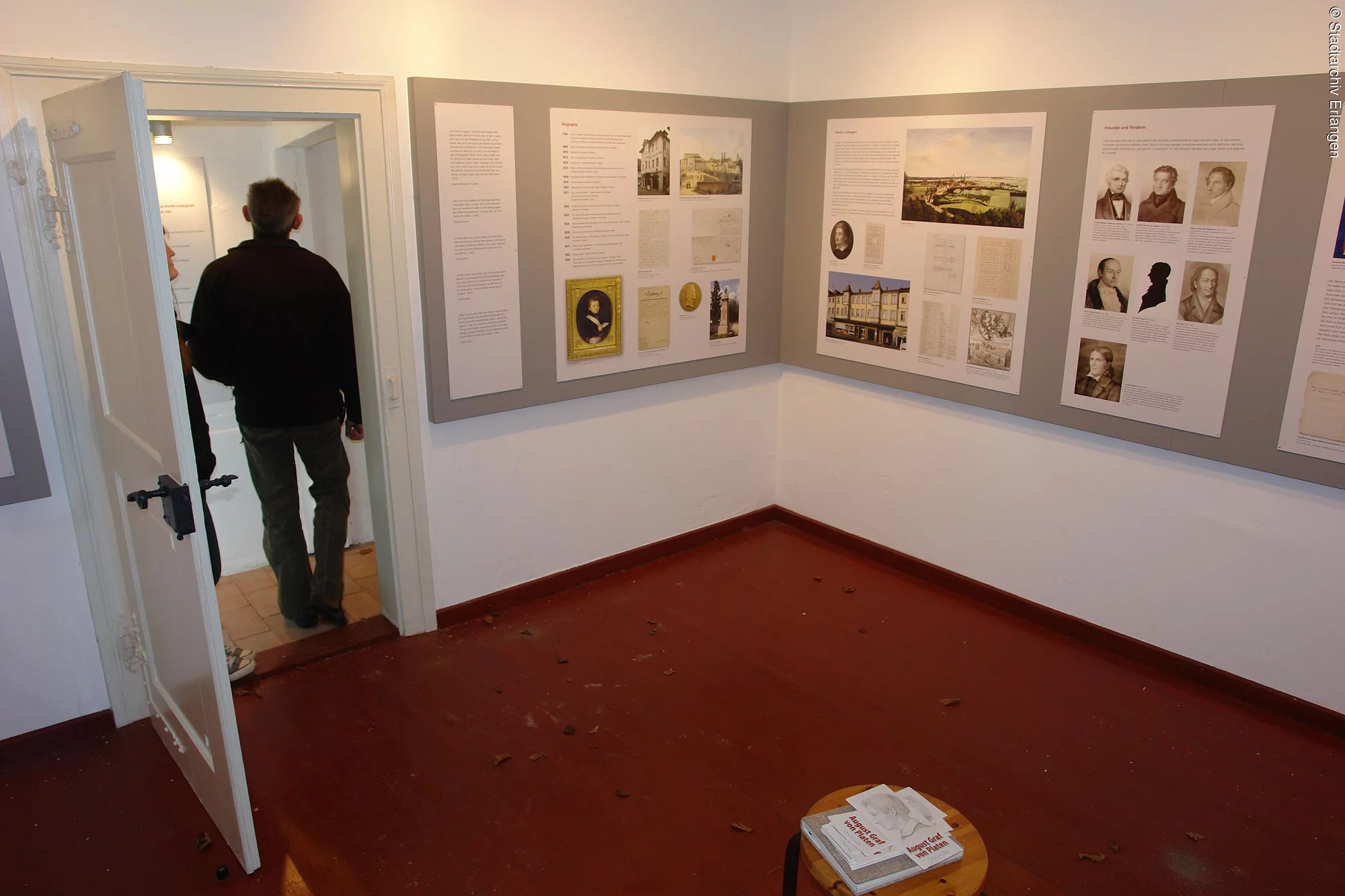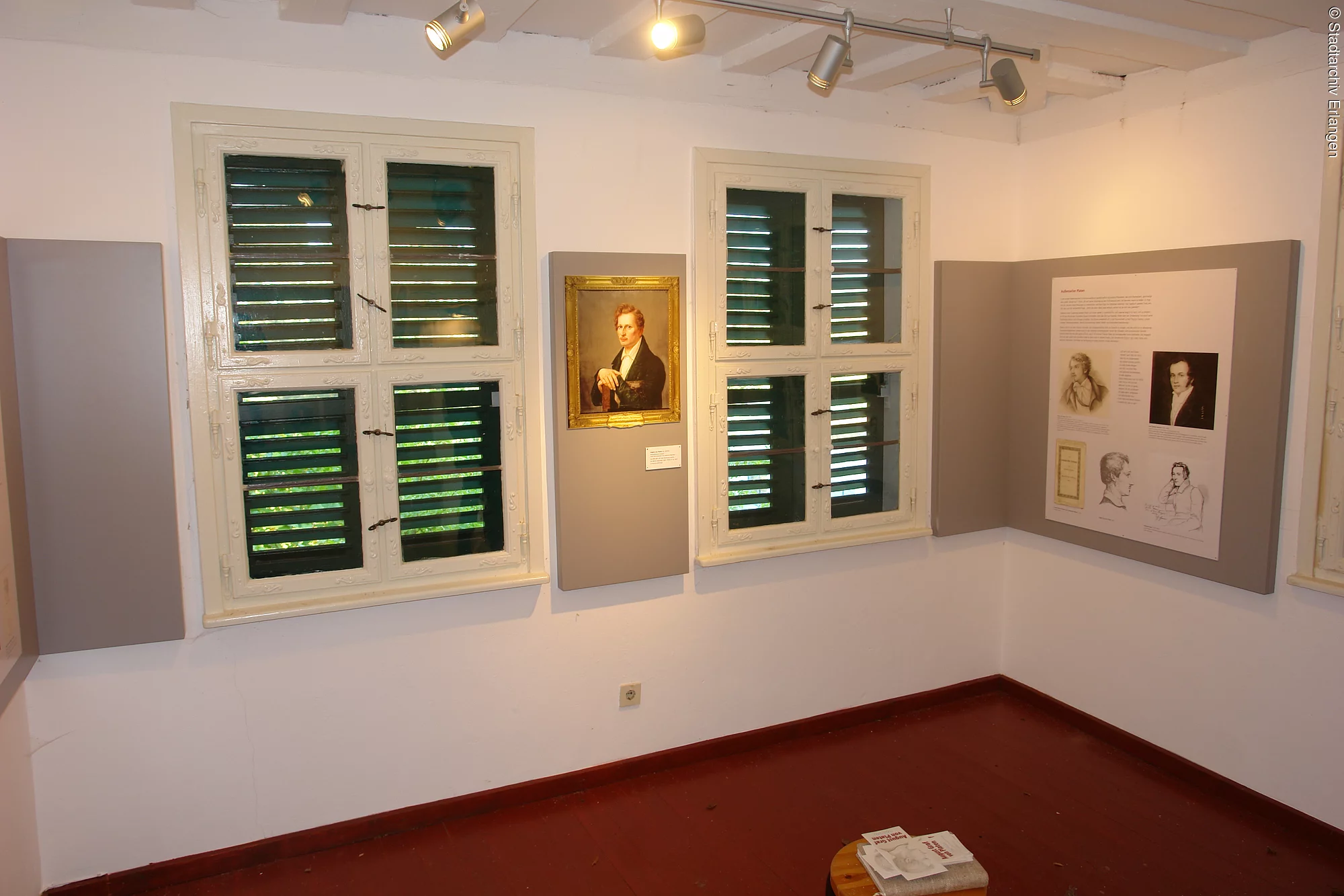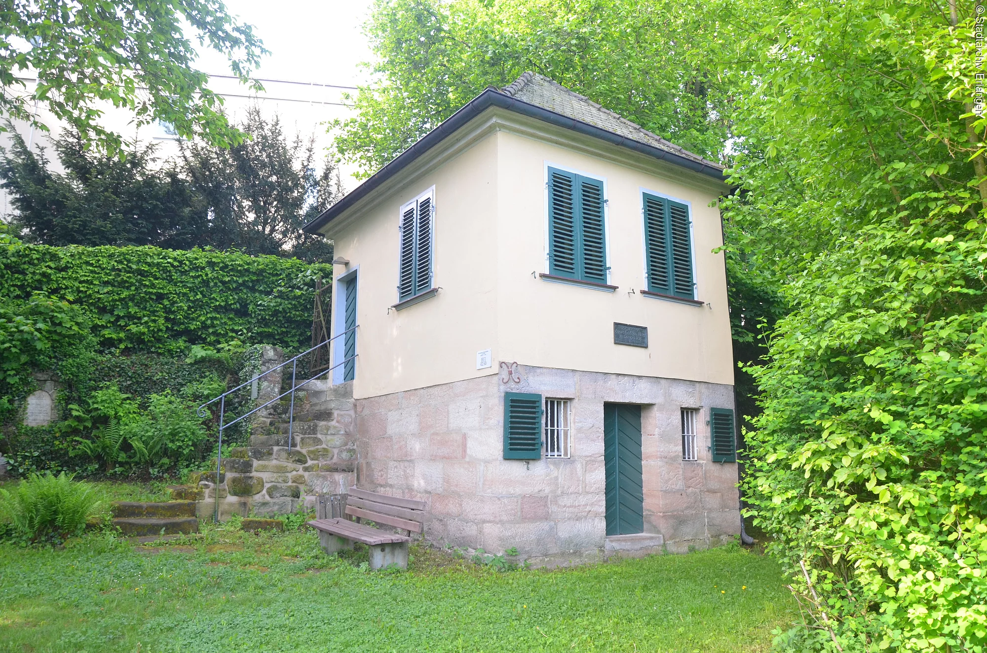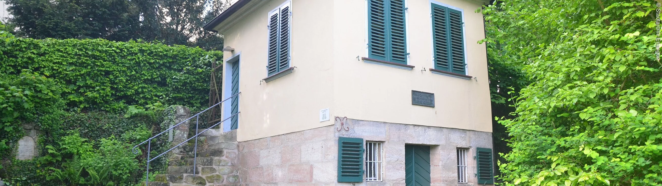 Der deutsche Dichter August Graf von Platen (geb. 24.10.1796, gest. 5.12.1835) studierte in Erlangen Sprach- und Literaturstudien und bezog in diesem Gartenhäuschen im Sommer 1824 sein Refugium. Hier entstand auch eines seiner Werke, das Lustspiel „Der Schatz des Rhampsinit“. Heute ist das Erlanger Stadtarchiv im Besitz des Platenarchivs, eine Sammlung an Werken von und über den Dichter.
