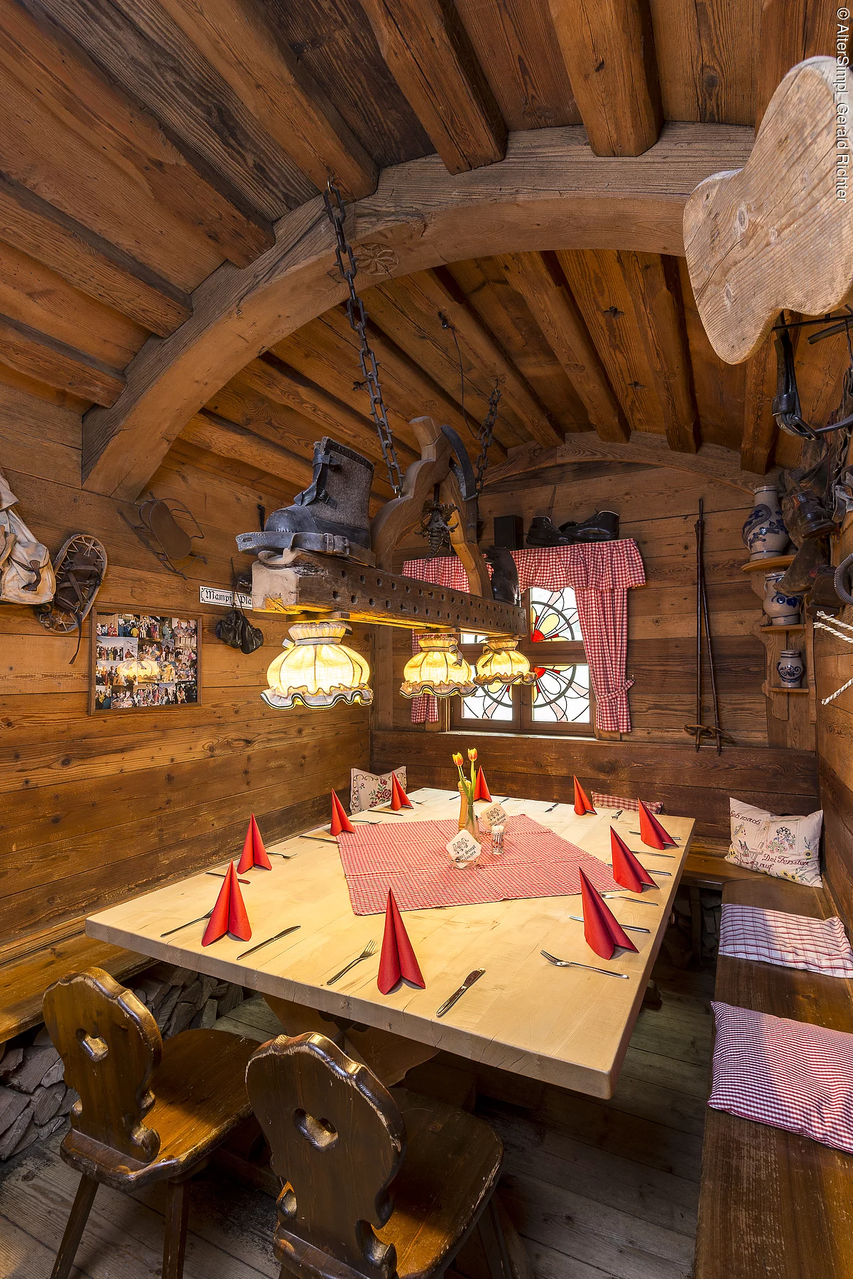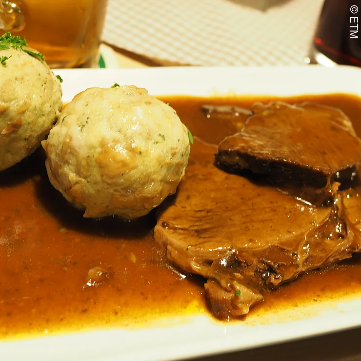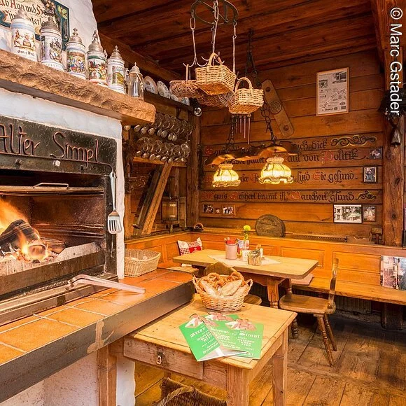 Auf der Speisekarte stehen Schäuferle, hausgemachte Rostbratwurst, Leberkäse, Fleischküchlein und Käsespätzle. Durchgehend bietet der Alte Simpl warme Küche.