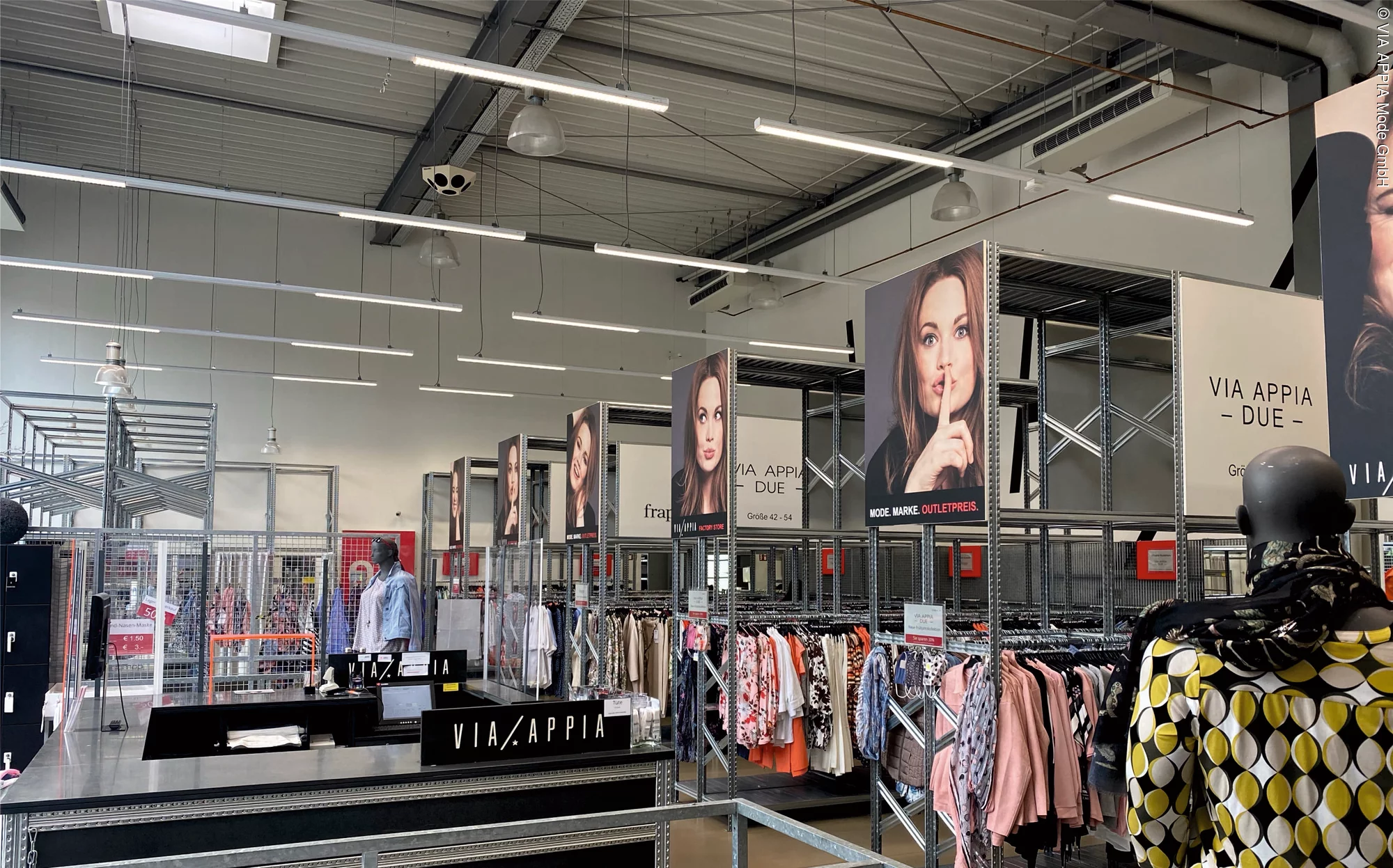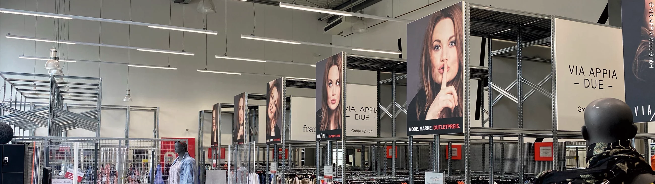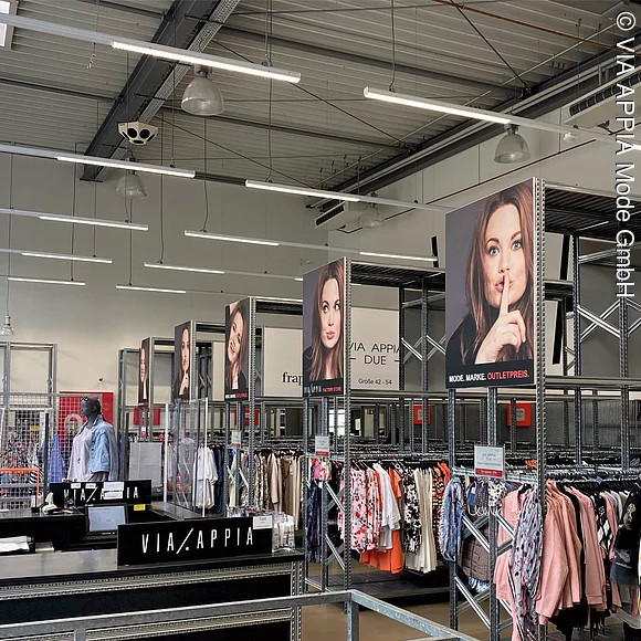 Auf einer Verkaufsfläche von 300 Quadratmetern gibt es ein wunderbares Angebot an Shirts, Pullover, Blusen, Hosen Kleider, das die Damenwelt begeistert. Und das selbstverständlich zu attraktiven Schnäppchenpreisen. Das breite Angebot an B-Ware, Restposten, Musterkollektionen, Überhängen und Prototypen lädt zum ausgiebigen Shopping ein. Neben den Kollektionen von Via Appia und Miss Via in den Größe 36 bis 48, präsentieren sich mit den Marken Via Appia Due und frapp eine große Auswahl in den Plus-Größen von 42 bis 54. Auch für ausreichend Parkplätze ist gesorgt und Kunden können an der E-Ladestation kostenlos ihr Auto oder Fahrrad laden.