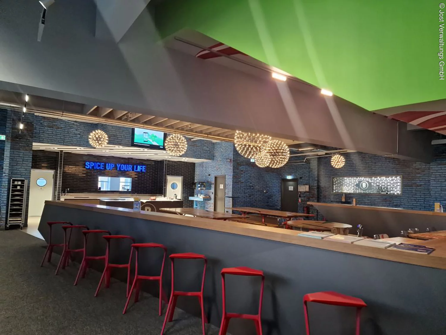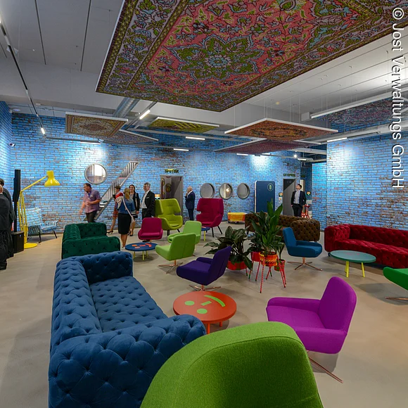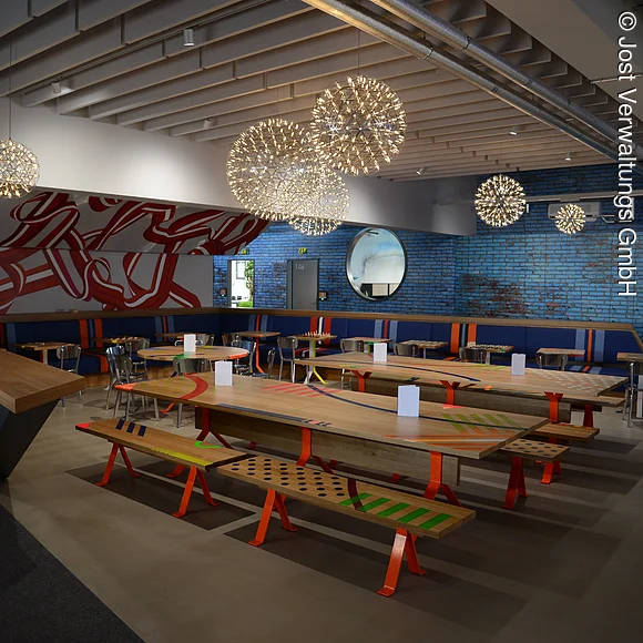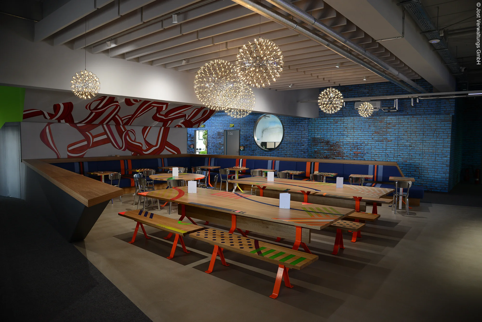 Bunte Design Elemente an der Decke, auf den Tischen sowie an der Wand. Die Tische stehen in U-Form.