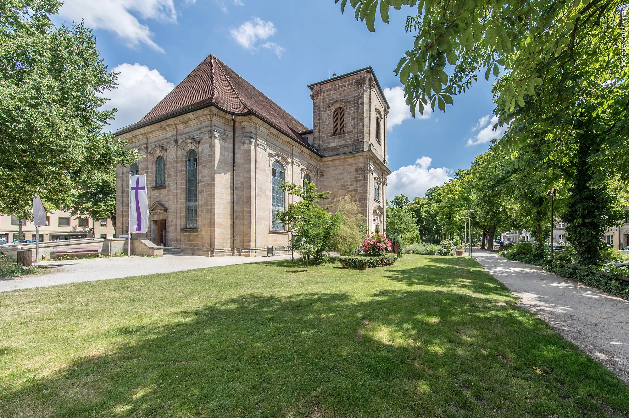 Wir starten unseren Rundweg durch Erlangen an der Touristeninformation (nähe Bahnhof). Erste Station ist die Hugenottenkirche, ein Wahrzeichen der Stadt Erlangen. Zwischen 1686 und 1693 wurde das erste Gotteshaus der Hugenotten außerhalb von Frankreich erbaut.