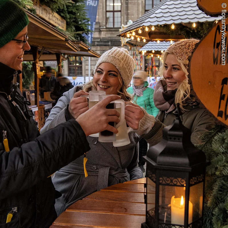 Unsere Weihnachtsmärkte bieten eine festliche Atmosphäre mit kulinarischen Köstlichkeiten wie Glühwein und gebrannten Mandeln sowie einzigartigen Geschenken und Handwerkskunst. Stimmungsvolle Beleuchtung, musikalische Darbietungen und festliche Dekorationen laden zum Bummeln und Genießen ein. Attraktionen wie historische Karusselle sorgen für Spaß bei Kindern und Familien. Unser historischer Markt bietet zusätzlich besondere mittelalterliche Erlebnisse und ein abwechslungsreiches Programm. Auf dem Weihnachtsmarkt der Erlanger Altstadt lockt selbstgemachter Quittenpunsch, lokale Händerlinnen und Händler präsentieren Handgemachtes aus ihren Ateliers.